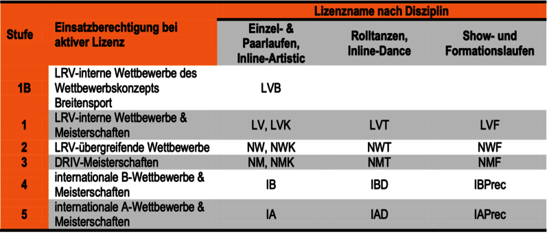 Innerhalb dieser Stufen gibt es für die unterschiedlichen Disziplinen jeweilige Lizenzen. Eine Übersicht der Lizenzinhaber kann der Wertungsrichterliste entnommen werden.
